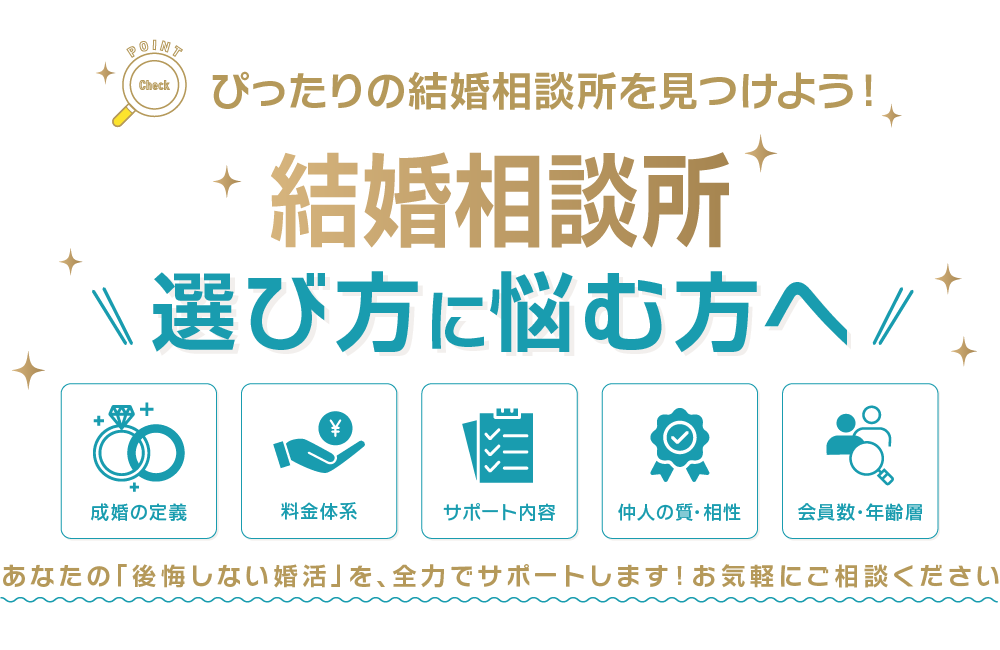 結婚相談所にはそれぞれ強みやサポート体制の違いがあります。成婚までしっかり寄り添ってくれる「あなたに合う相談所」を見つけることが大切です。「どこを選べばいいのか分からない…」という方には、専門スタッフがあなたの希望や条件をもとに、最適な相談所をご紹介します。